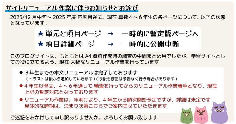 ※ 「捉え方・考え方などのポイント」について:算数では 育むべき資質や能力の「3つの柱」の2つ目である「 思考力、判断力、表現力など」を伸ばすために指導することが、各単元ごとに学習指導要領で指示されています(算数の場合です、指示の出され方は教科によって違います)。その内容を、作成者が個人的に要約し、ポイント的に添えたものです。